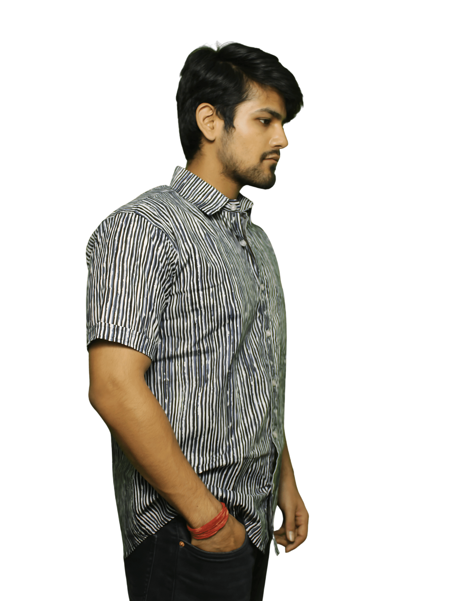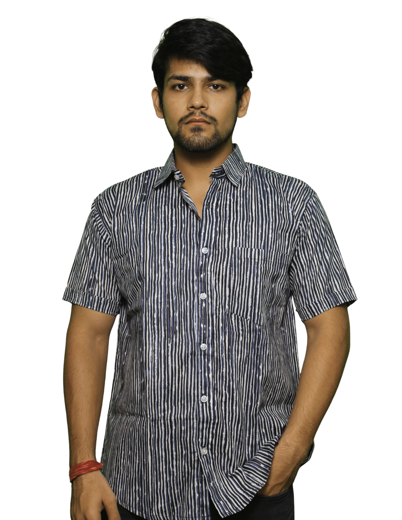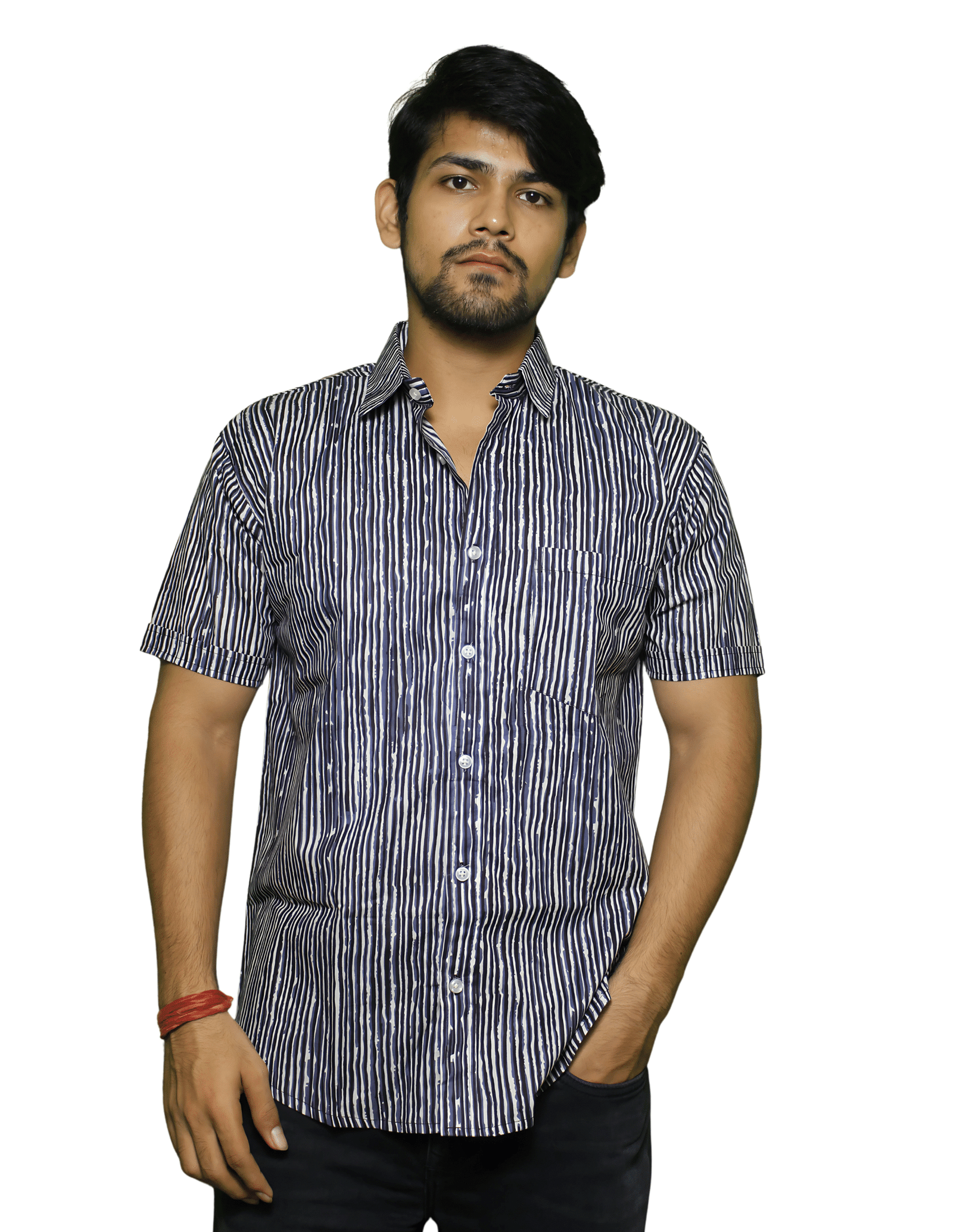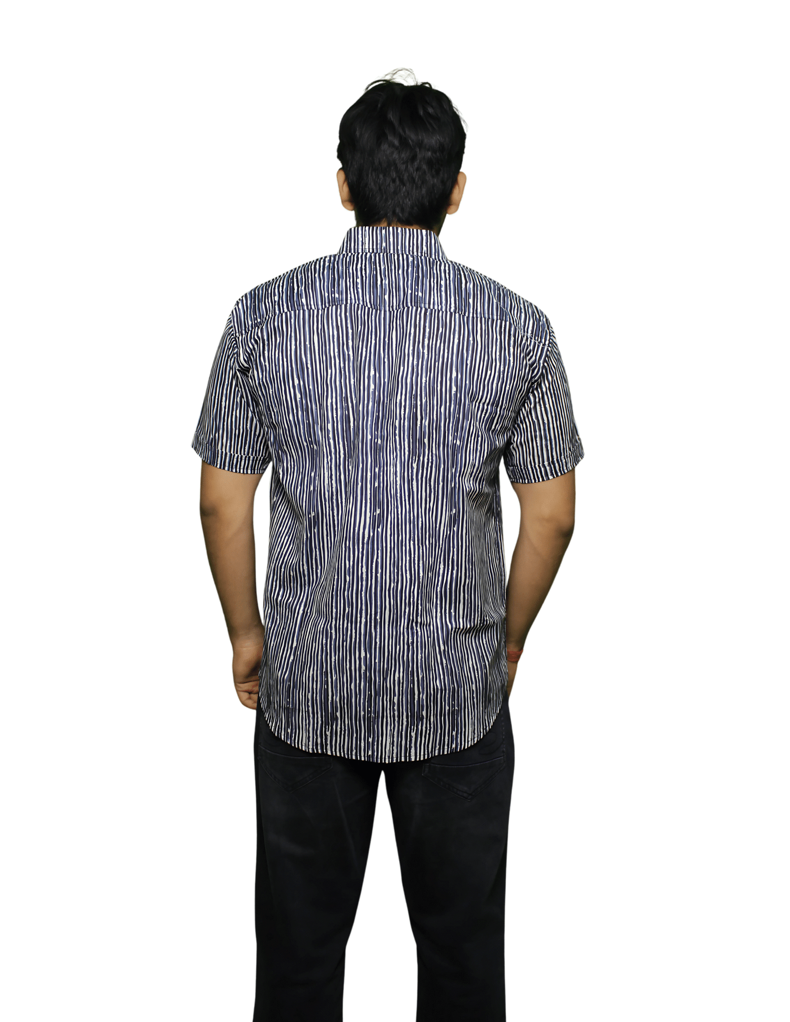 Made from 100% breathable cotton cambric, this shirt is block printed in Sanganer, Rajasthan, blending traditional techniques with modern minimal designs. The shirt features a black background with thin white vertical stripes, creating a clean, elegant, and versatile look. The striped design adds a slimming effect, making it perfect for both casual and semi-formal occasions.
