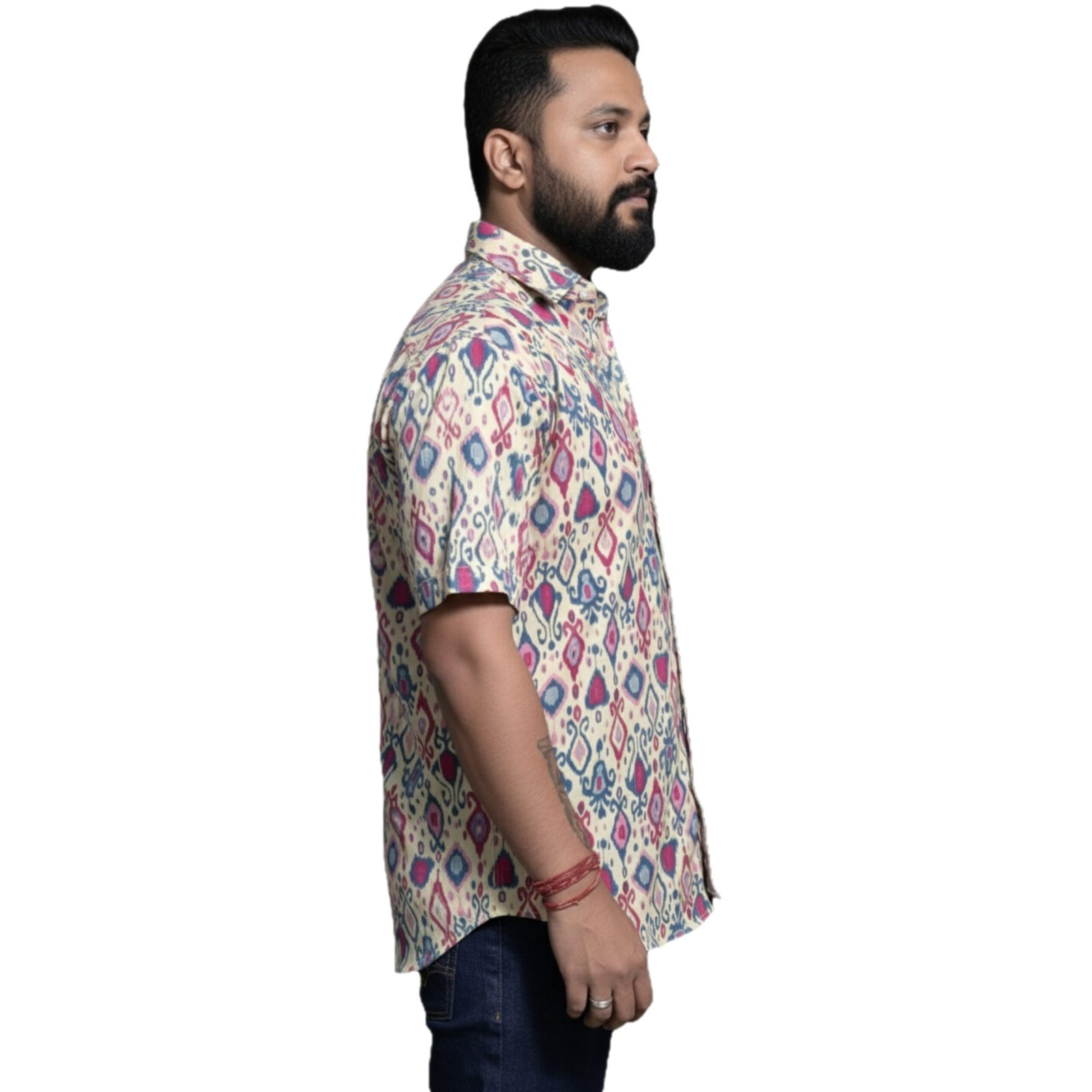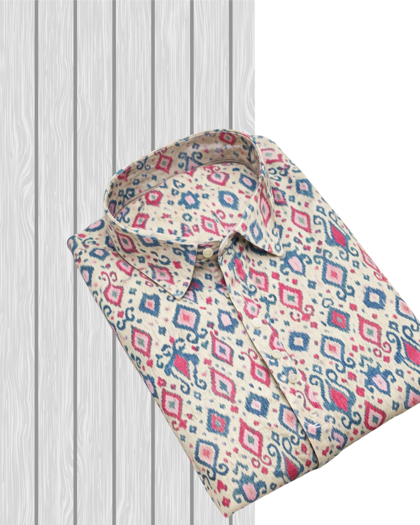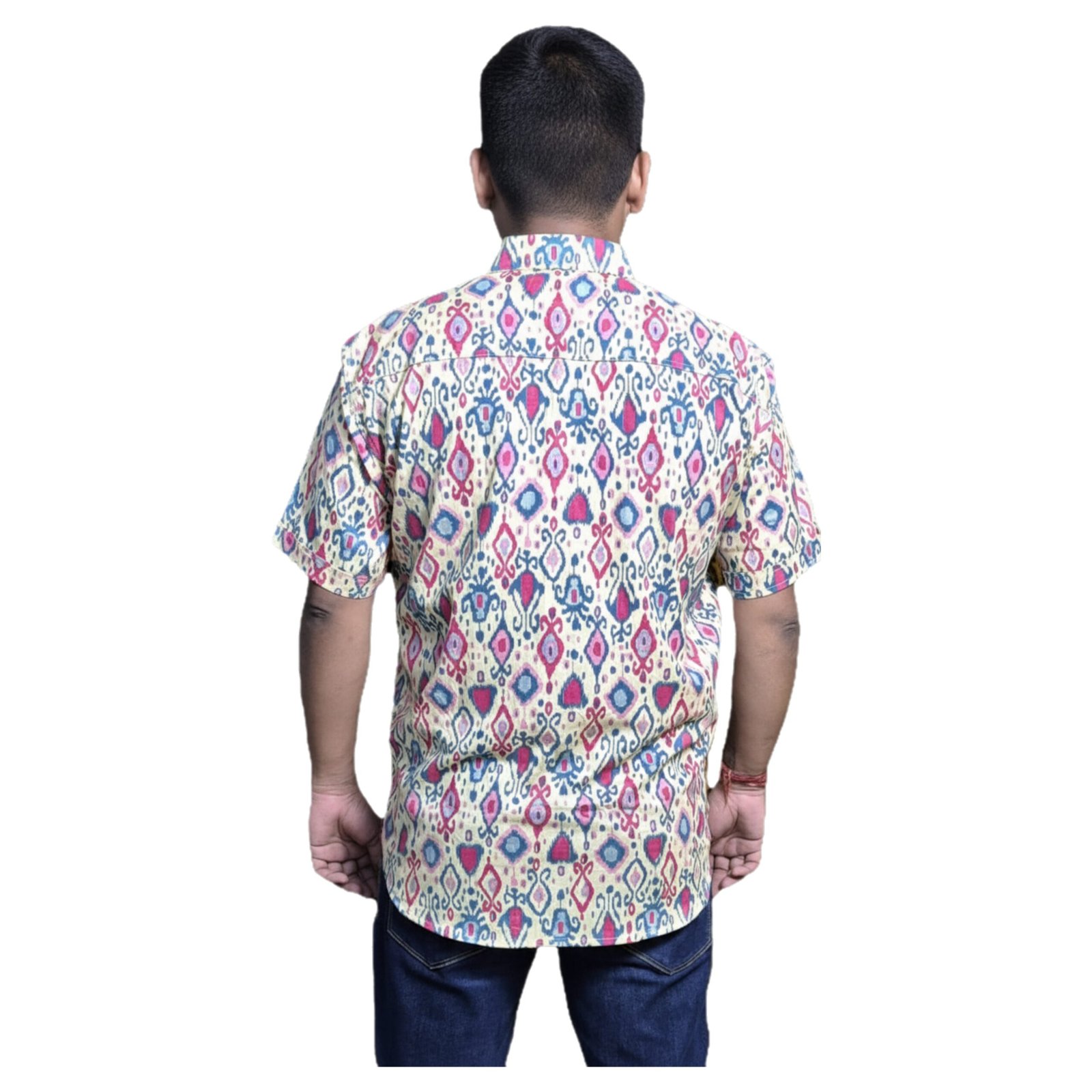 Made from 100% cotton cambric, this shirt is printed in Sanganer, Rajasthan, combining centuries-old block printing with contemporary ikat-inspired designs. The shirt features a cream base decorated with geometric diamond motifs in blue, red, and pink, creating a bold, eye-catching pattern. The vibrant contrasts make it a great pick for casual outings and festive gatherings.