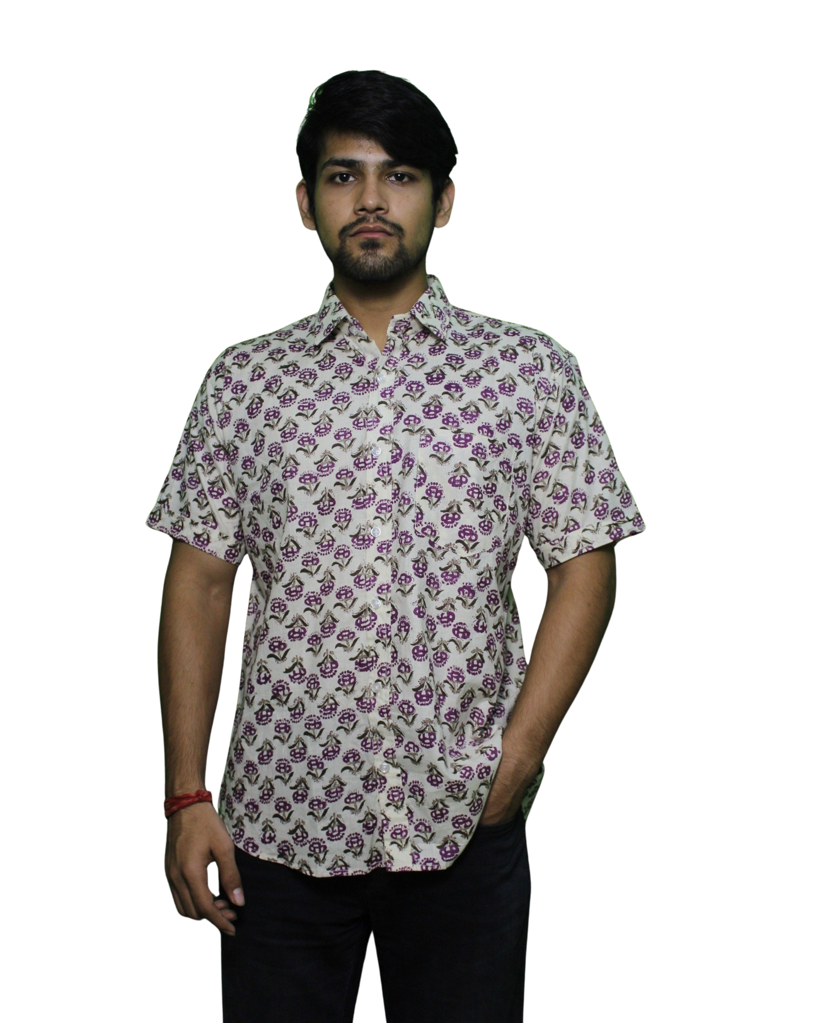 Made from soft cotton cambric, this shirt is hand block printed in Sanganer, Rajasthan, renowned for its detailed floral patterns and eco-friendly printing methods. The shirt features an off-white background with purple floral blooms and green leafy stems, giving it a fresh and graceful look.