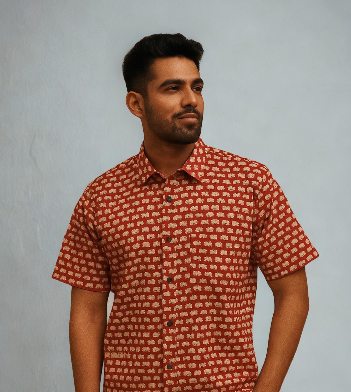 Men’s Sanganeri Elephant Print Shirt – Rust Red, Cotton Blend, Half SleeveMen’s Sanganeri Elephant Print Shirt – Rust Red, Cotton Blend, Half Sleeve