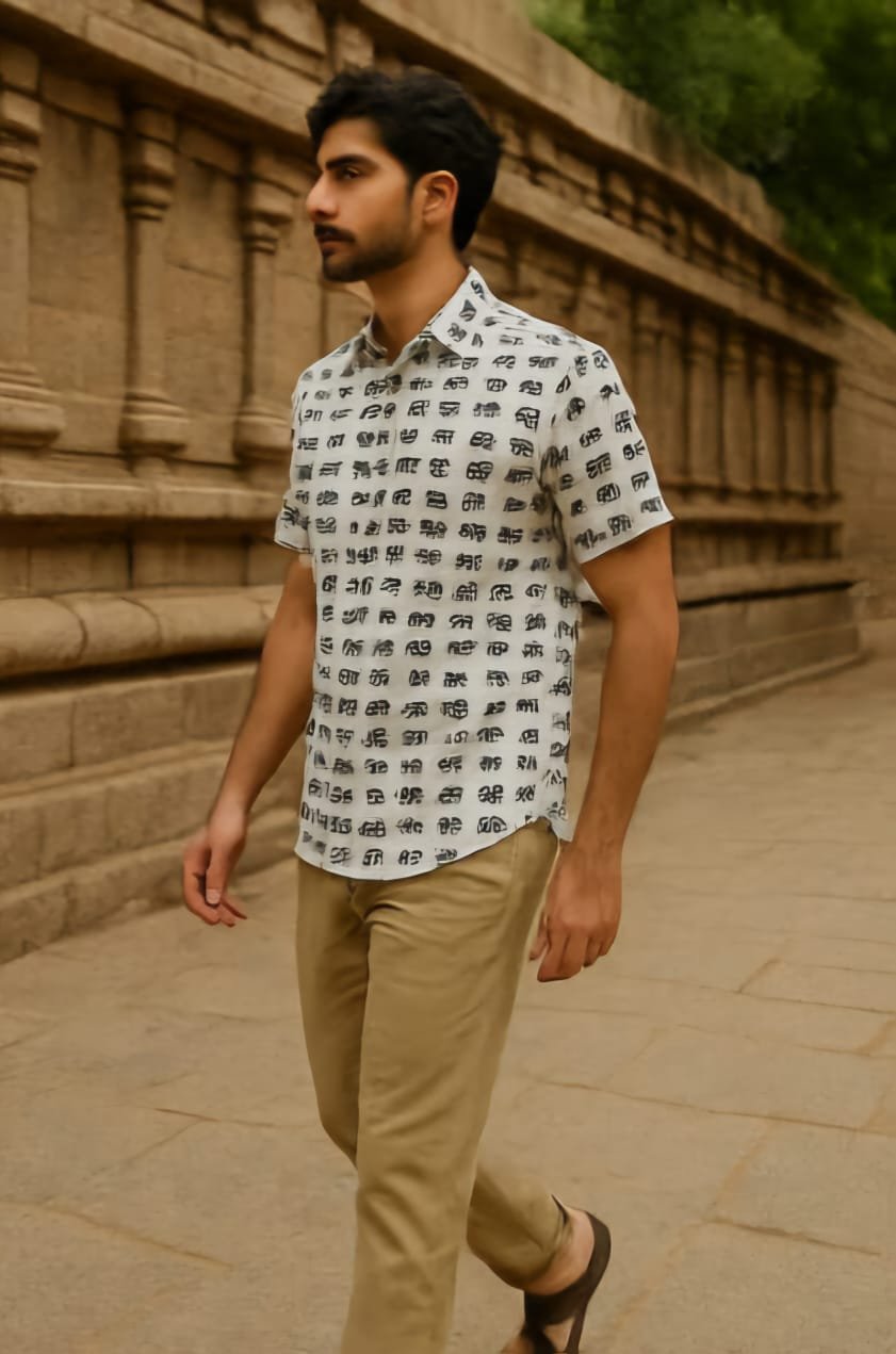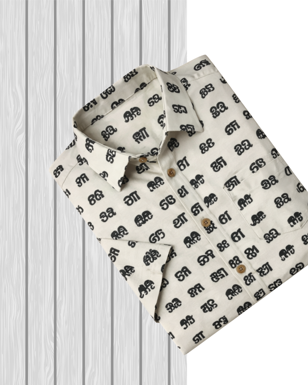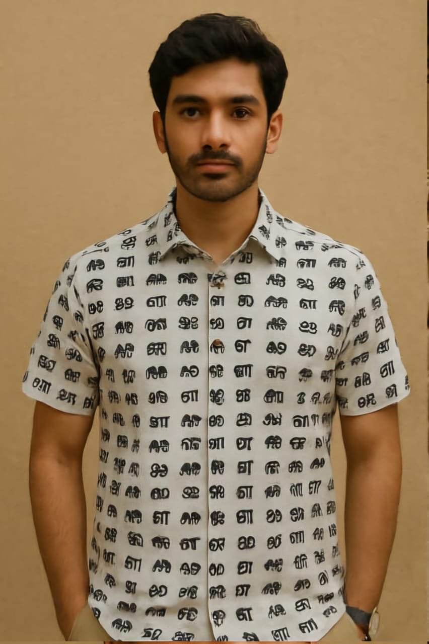 Men’s Sanganeri Script Print Shirt – Off White, Cotton Blend, Half Sleeve