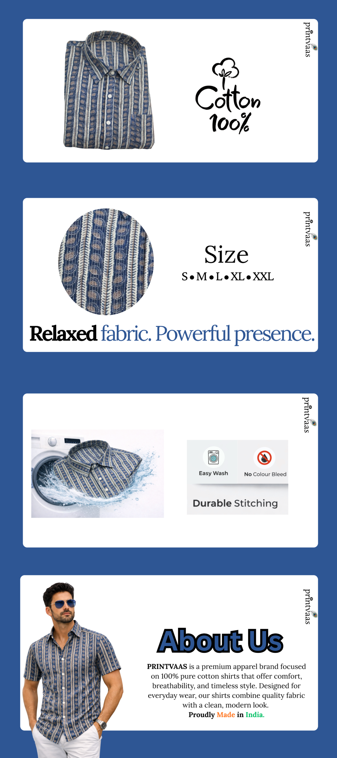 & Free ShippingHandcrafted cotton shirt featuring navy blue and brown striped Sanganeri print. Lightweight, breathable, and ideal for casual or semi-formal wear.