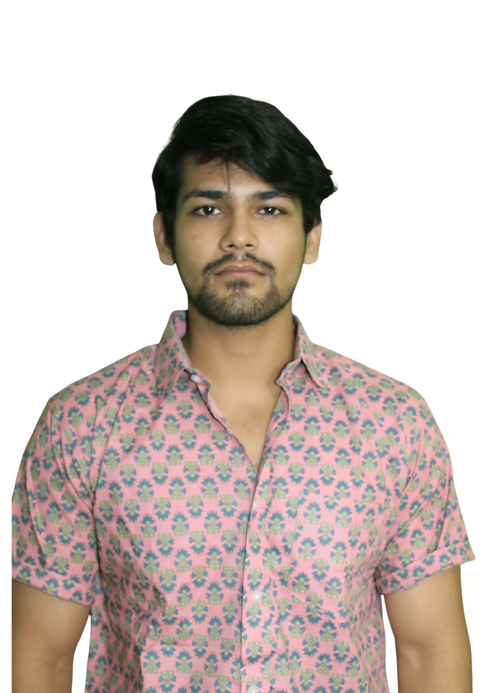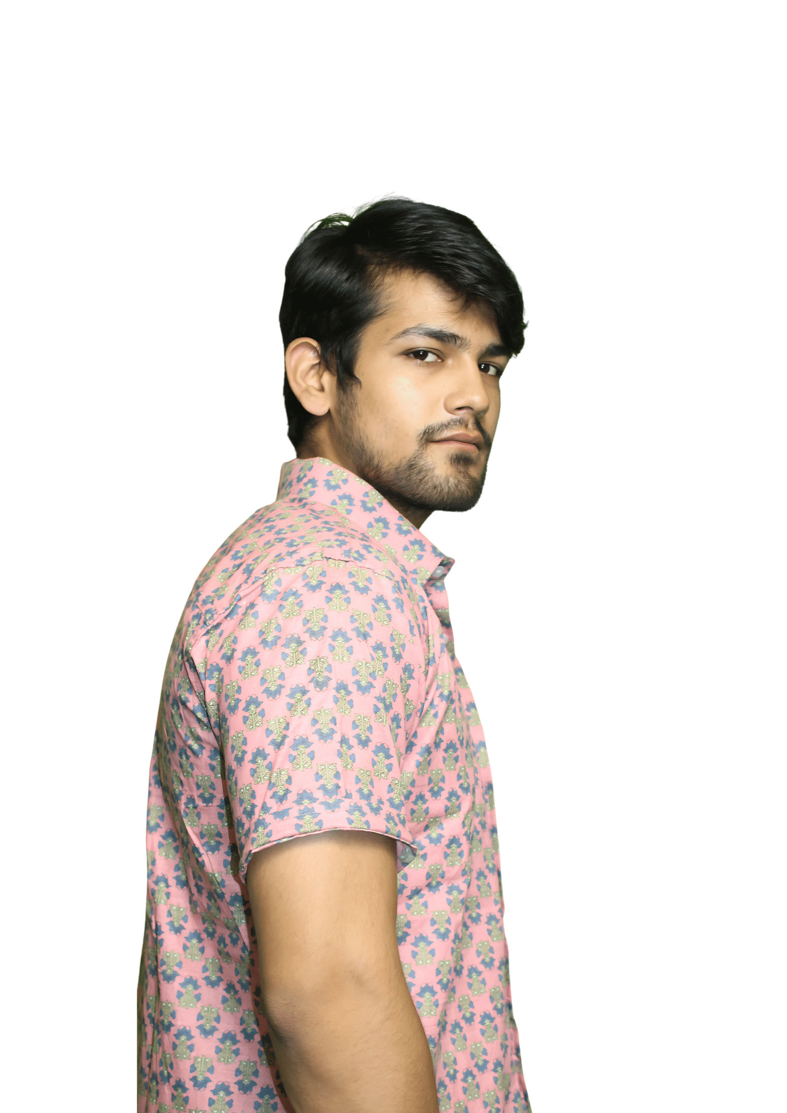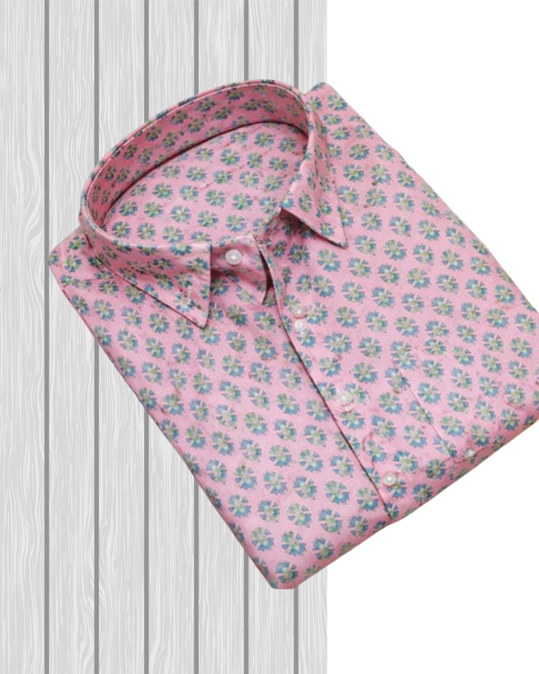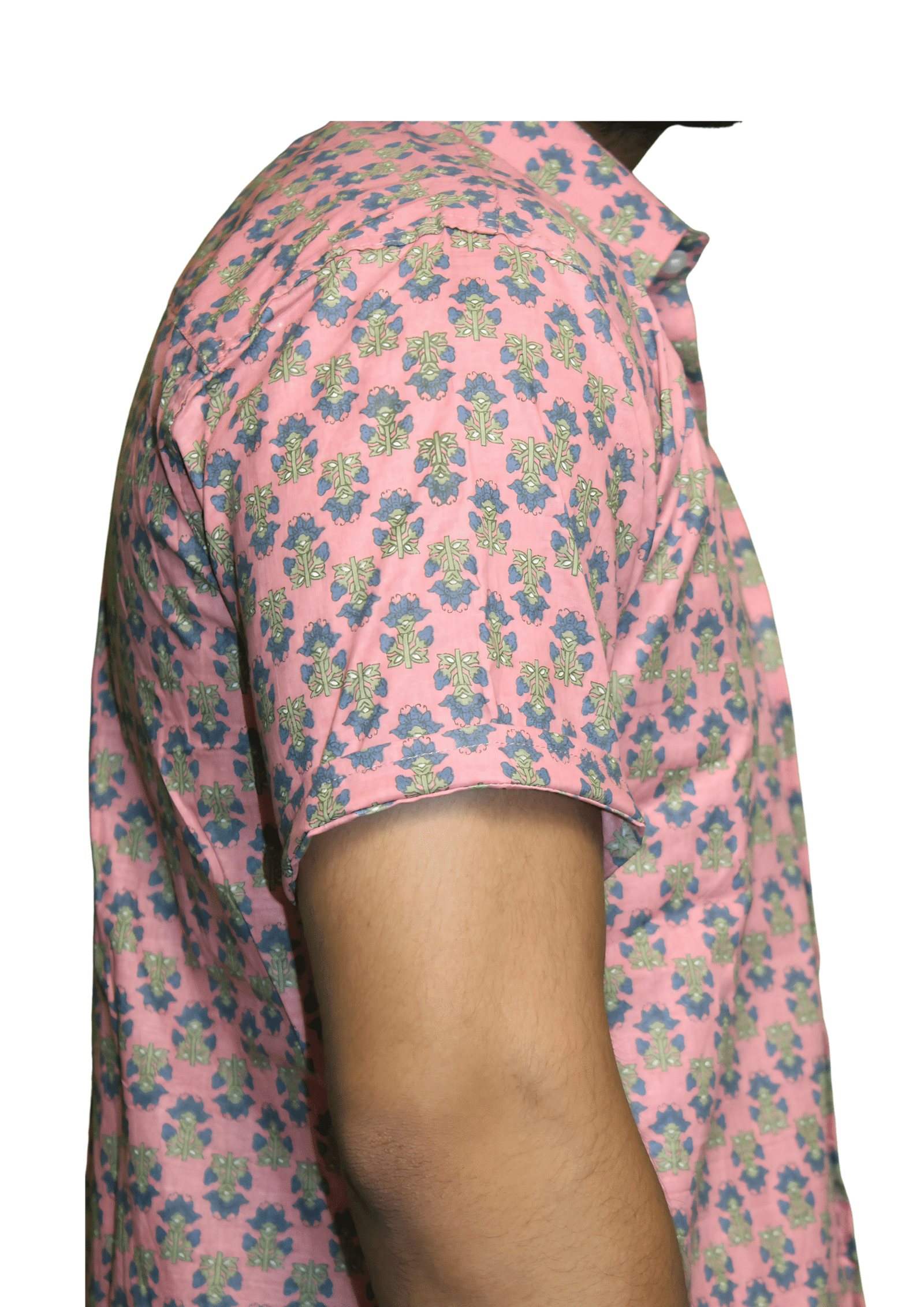 Crafted from soft cotton cambric, this shirt is printed using the traditional Sanganeri hand block technique from Rajasthan, which is known for its detailed floral motifs and vibrant designs. The shirt showcases a pink background covered with tiny floral motifs in blue and green, offering a bright yet elegant look.