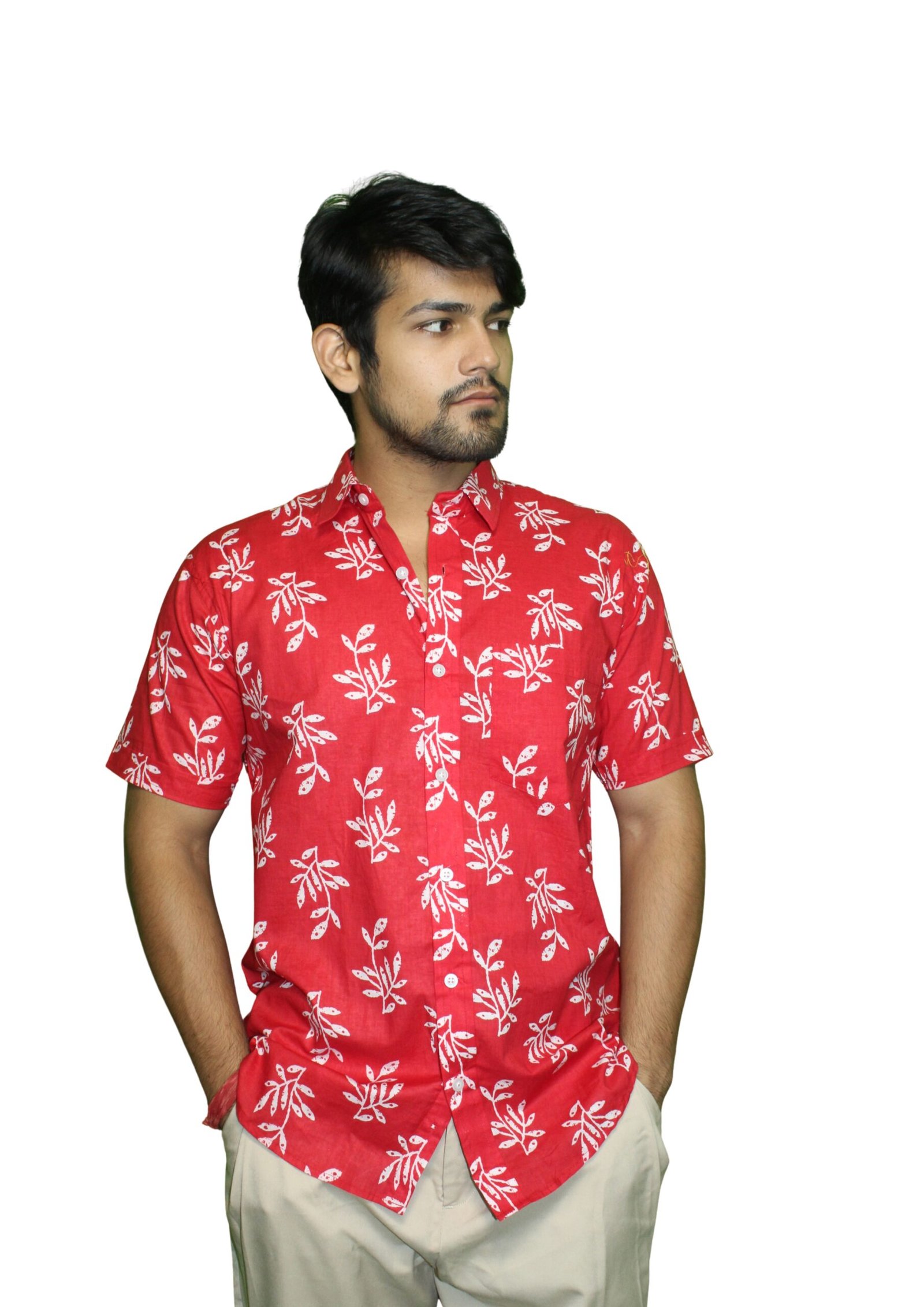 Red Leafy Floral Sanganeri Hand Block Printed Half Sleeve Cotton ShirtRed Leafy Floral Sanganeri Hand Block Printed Half Sleeve Cotton Shirt