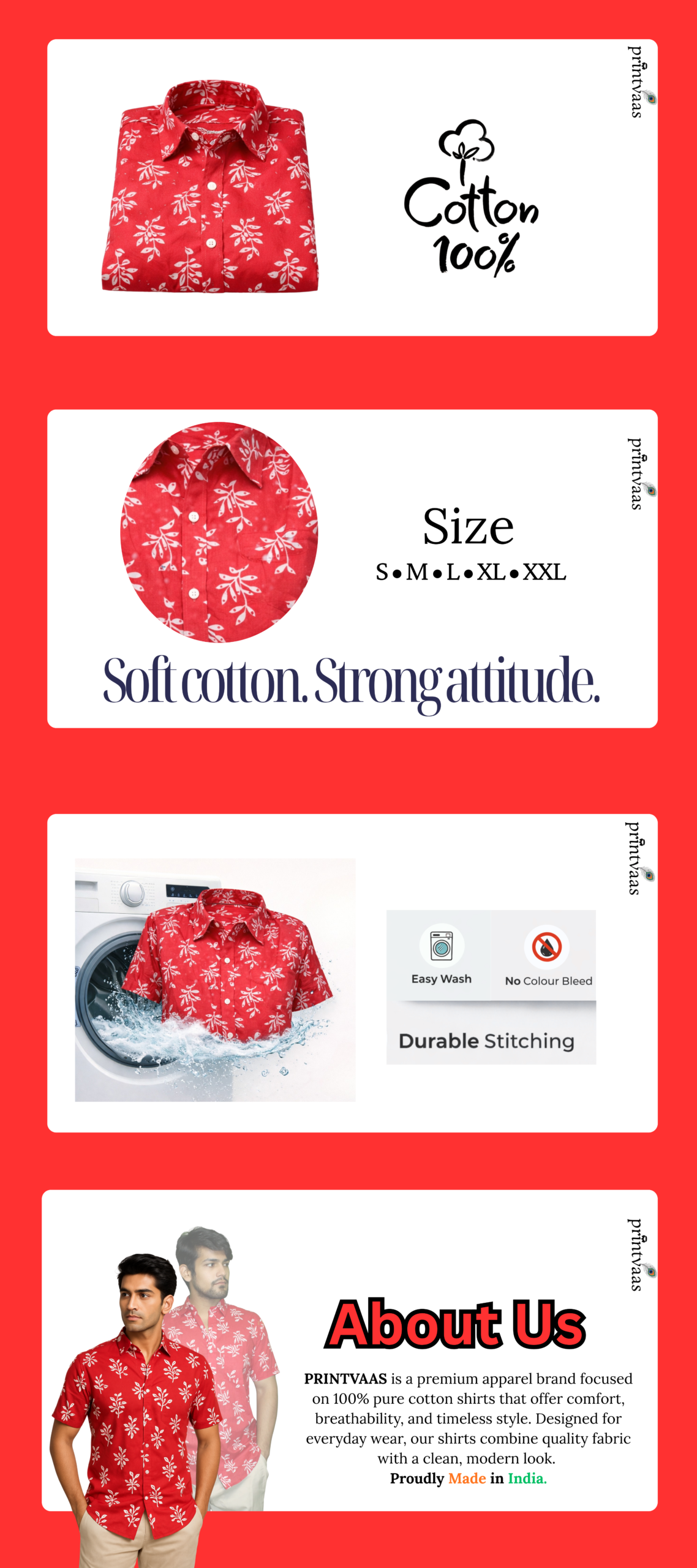 Bright red base with white leafy motifs | Hand block printed | 100% Cotton Cambric | Soft & breathable | Half sleeves